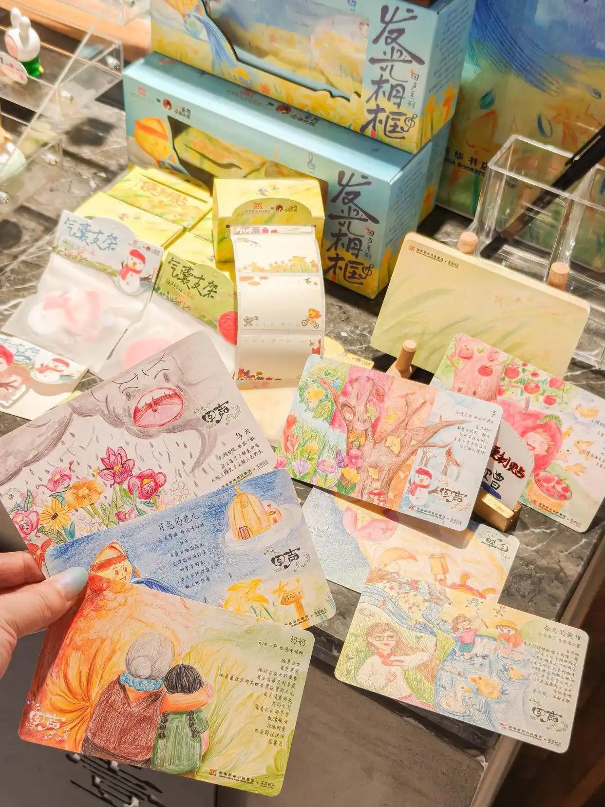 湖南新华书店集团旗下11家门店,设置了“诗歌交换”专区。读者免费领取主题卡,写下想对孩子说的话、一首诗或一幅涂鸦,投入“给童年的信”邮箱,然后从“给长大的梦”盲盒中随机抽取一张明信片。这些明信片均取材于湖南人民出版社出版的《田野诗班》一书,每一张都是孩子亲笔写下的诗句或涂鸦。