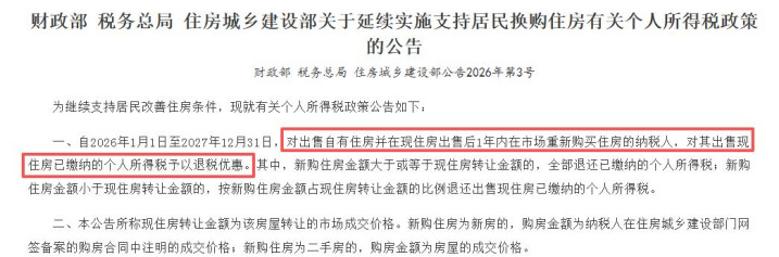 财政部、税务总局、住房城乡建设部三大与房地产关系最紧密的部门发布联合公告,明确置换住房的个人所得税优惠政策延续至2027年底。