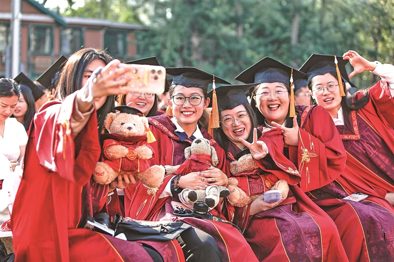2025年6月23日,北京某高校毕业生在毕业典礼上拍照留念。新华社发