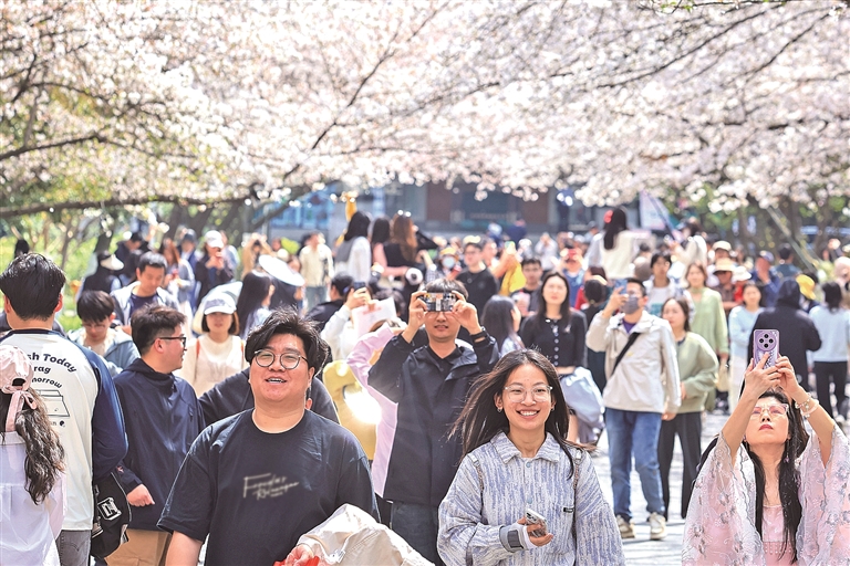 2025年3月24日,人们在南京某大学校园里赏花。新华社发